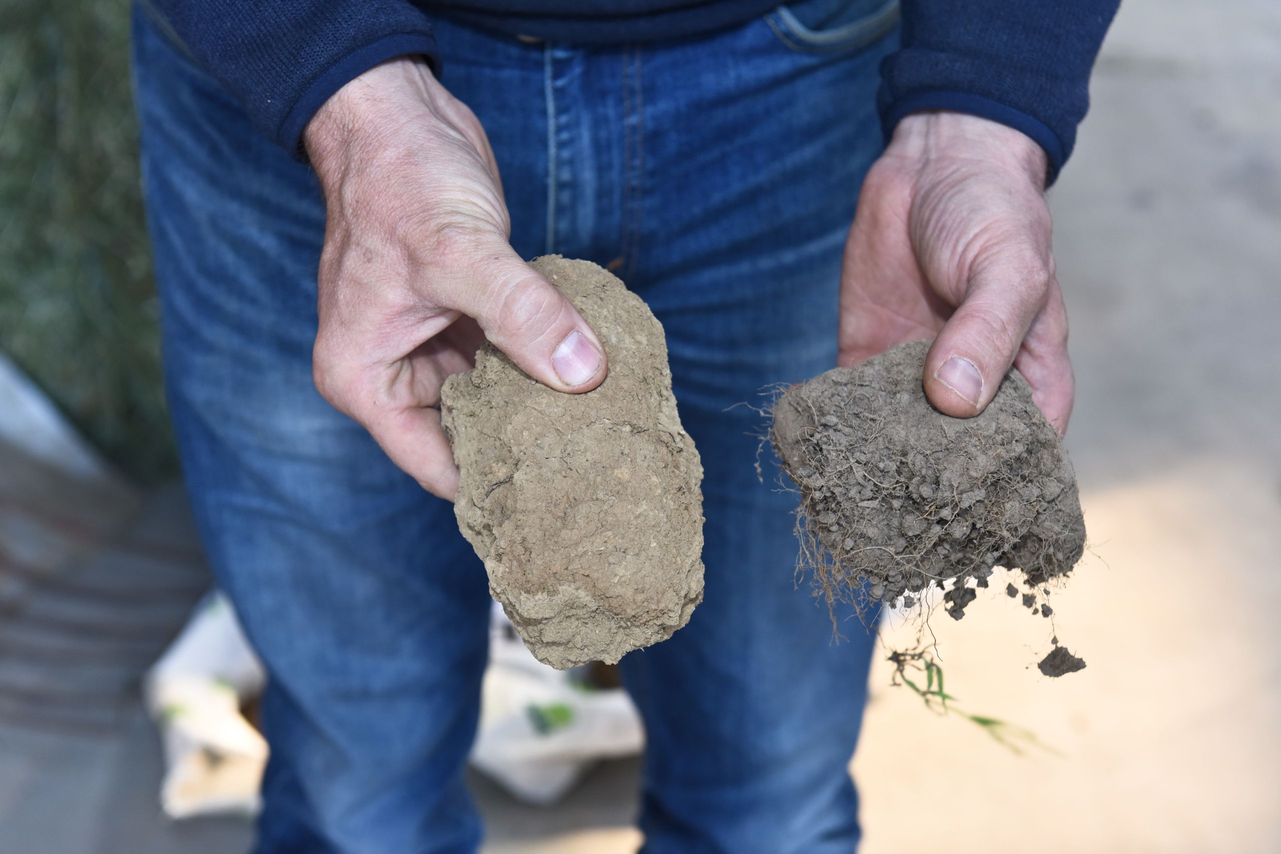 « Les deux échantillons proviennent pourtant de la même parcelle de terre, commente Nicolas Verschuere. Mais l'une provient d'une partie cultivée de façon conventionnelle ; l'autre d'une partie sur laquelle on applique depuis quelques années les principes de l'agriculture régénérative. » D'un côté, à force d'exploitation intensive année après année, la terre est « stérilisée », dénuée de toute structure faute de matière organique et en l'absence de système racinaire qui l'aiderait à renforcer sa trame, comme une pièce de tissu.