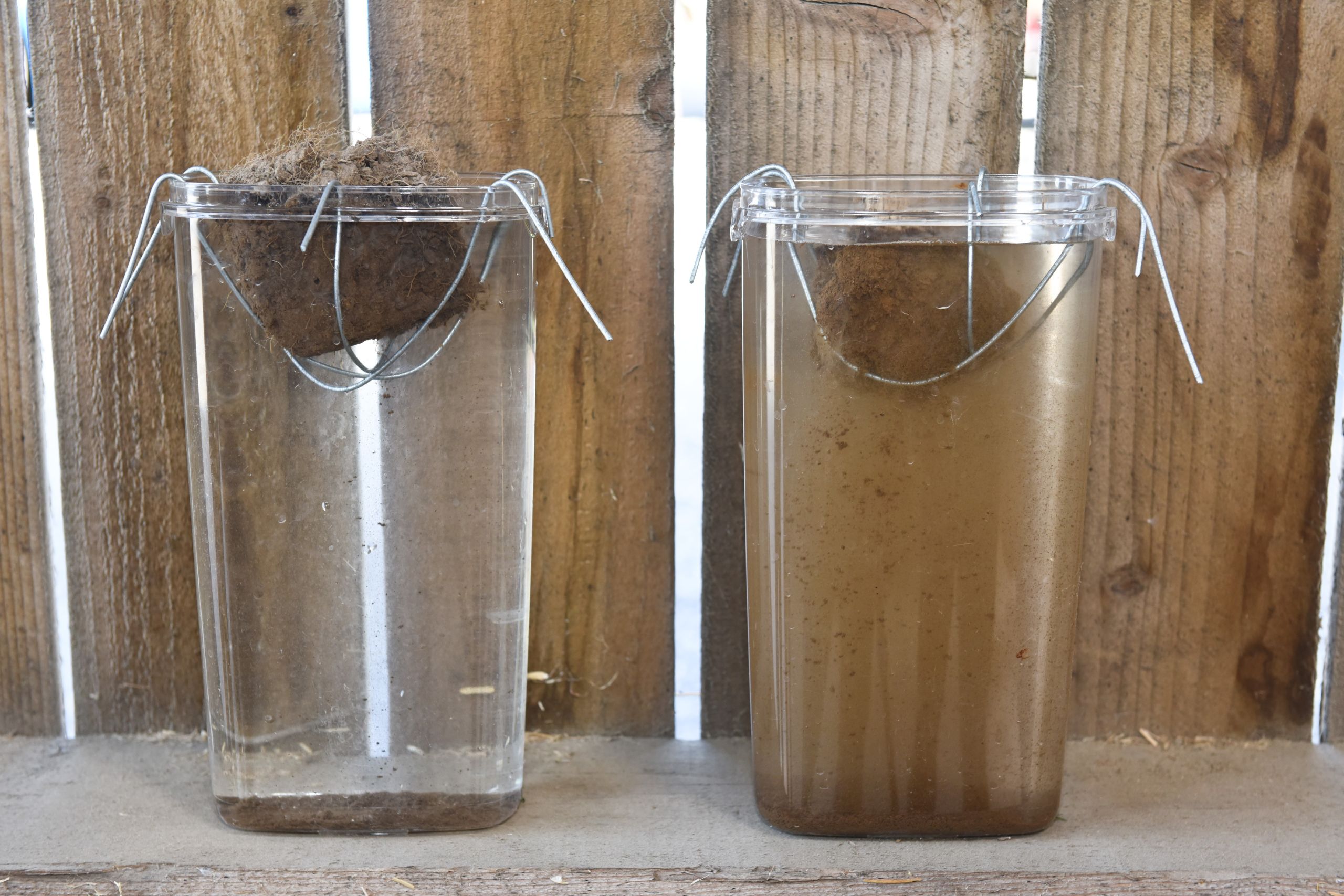 5, 4, 3, 2, 1… Go! Reposant sur un support en fil de fer, les deux mottes de terre sont plongées dans un récipient rempli d'eau. En une cinquantaine de secondes à peine, celle de droite – couleur chocolat au lait – se désagrège de façon spectaculaire. Dans le bocal voisin, l'autre motte – qui tire davantage vers le chocolat noir – se gorge progressivement d'eau, tout en conservant sa structure.