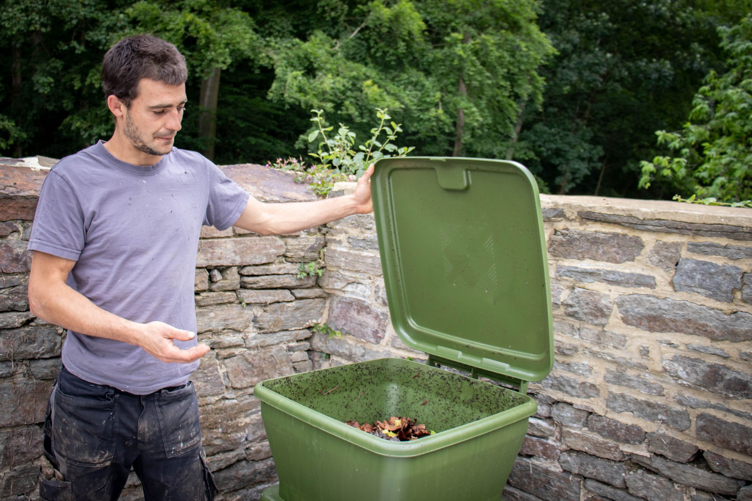 Ce qui ressemble à une simple poubelle de plastique verte est en fait un précieux écrin. Plongés dans la pénombre du compartiment supérieur, des lombrics travaillent d’arche pied.