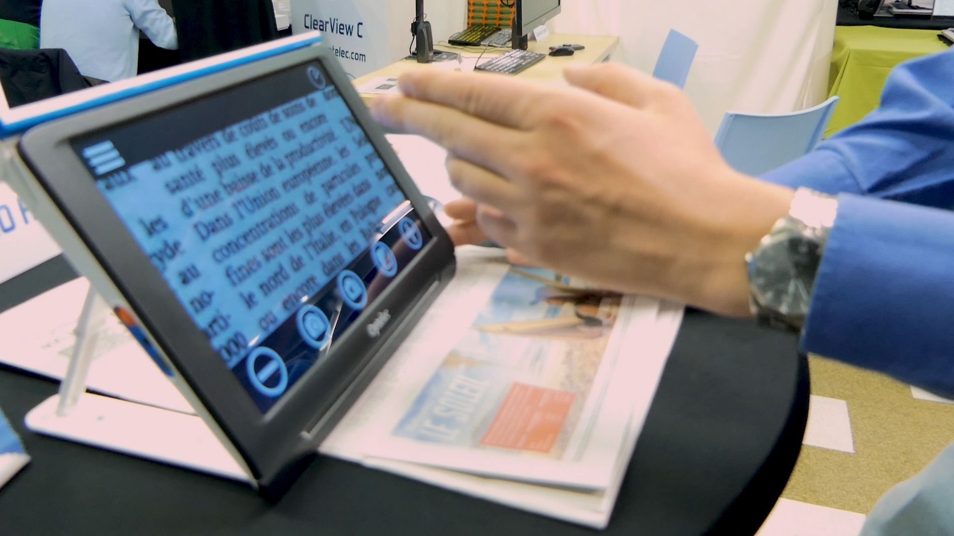 “Au salon, il n’y a pas d’innovation chaque année”, note Xavier Guerra. “Mais malgré tout, des évolutions.” Il évoque notamment une double caméra portable qui fonctionne comme un projecteur mais permet de faire une présentation sur un grand écran avec des caractères normaux et pour la personne malvoyante de lire sa présentation en agrandissement. “Ce matériel est de plus en plus léger. Avant il pesait 7 kilos. Aujourd’hui on est à 4 kilos. C’est une différence importante pour un appareil portable.”