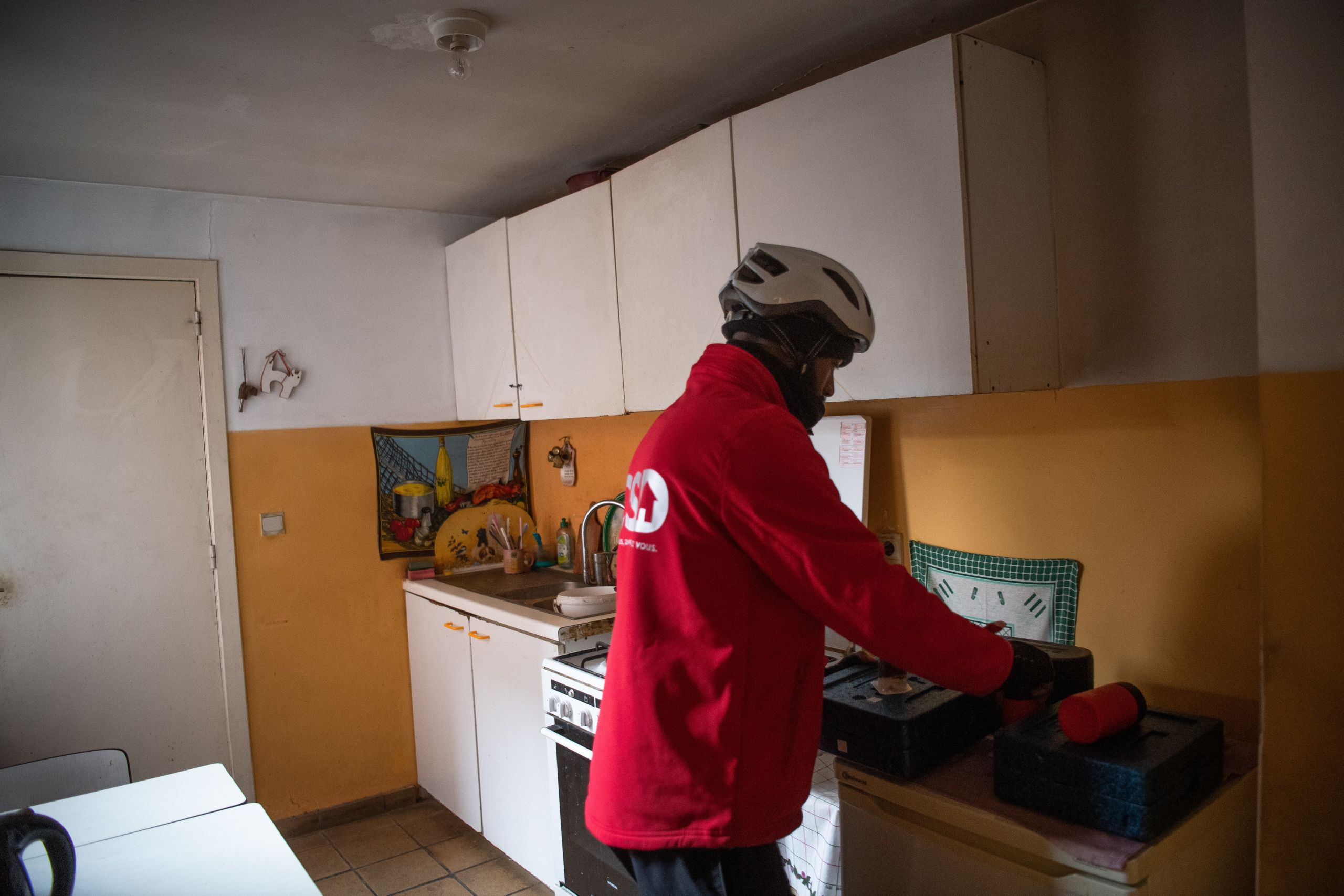 Monsieur Daeseleer veille d’un œil par la porte entrouverte. Après l’avoir salué, le livreur entre dans l’appartement et se dirige automatiquement vers la cuisine, dépose la boîte sur le plan de travail et reprend celle de la veille. Le résident reçoit tous les jours son repas de midi. Les deux hommes se connaissent et échangent quelques mots.
