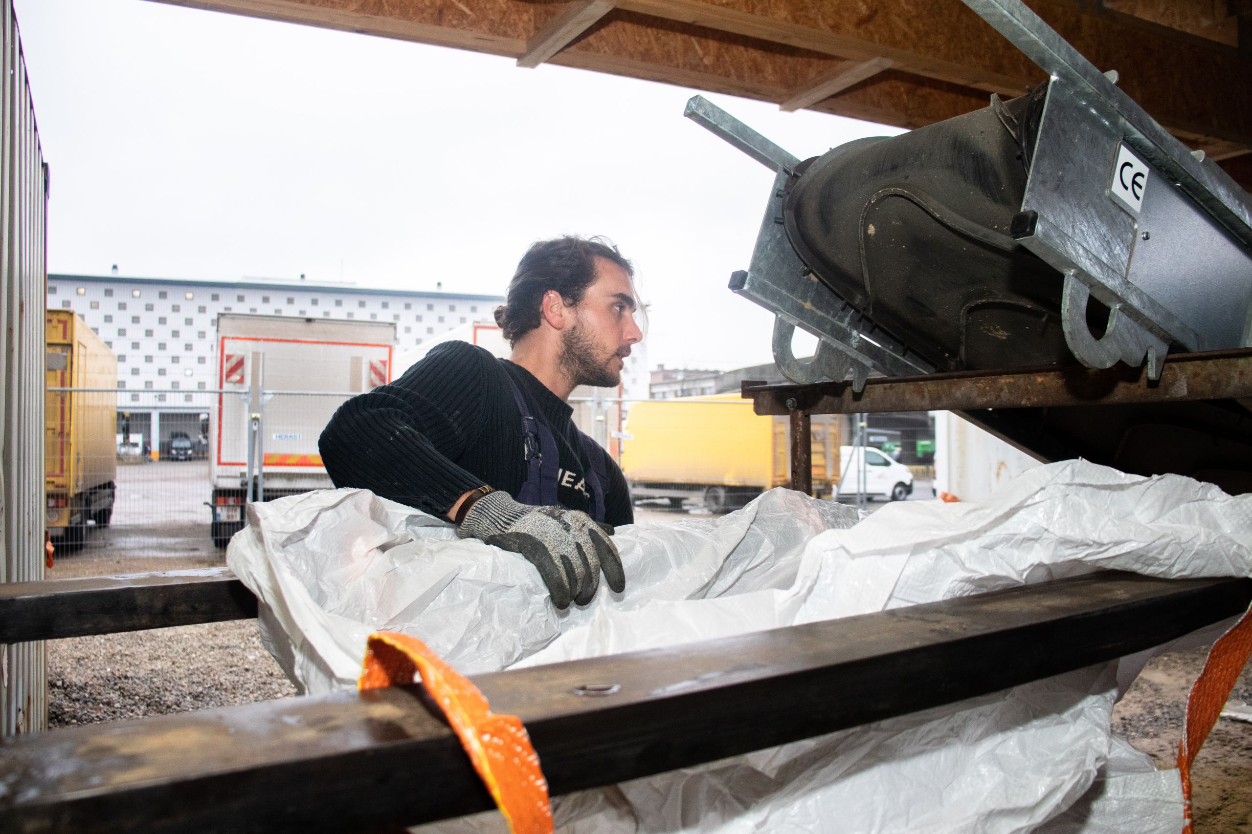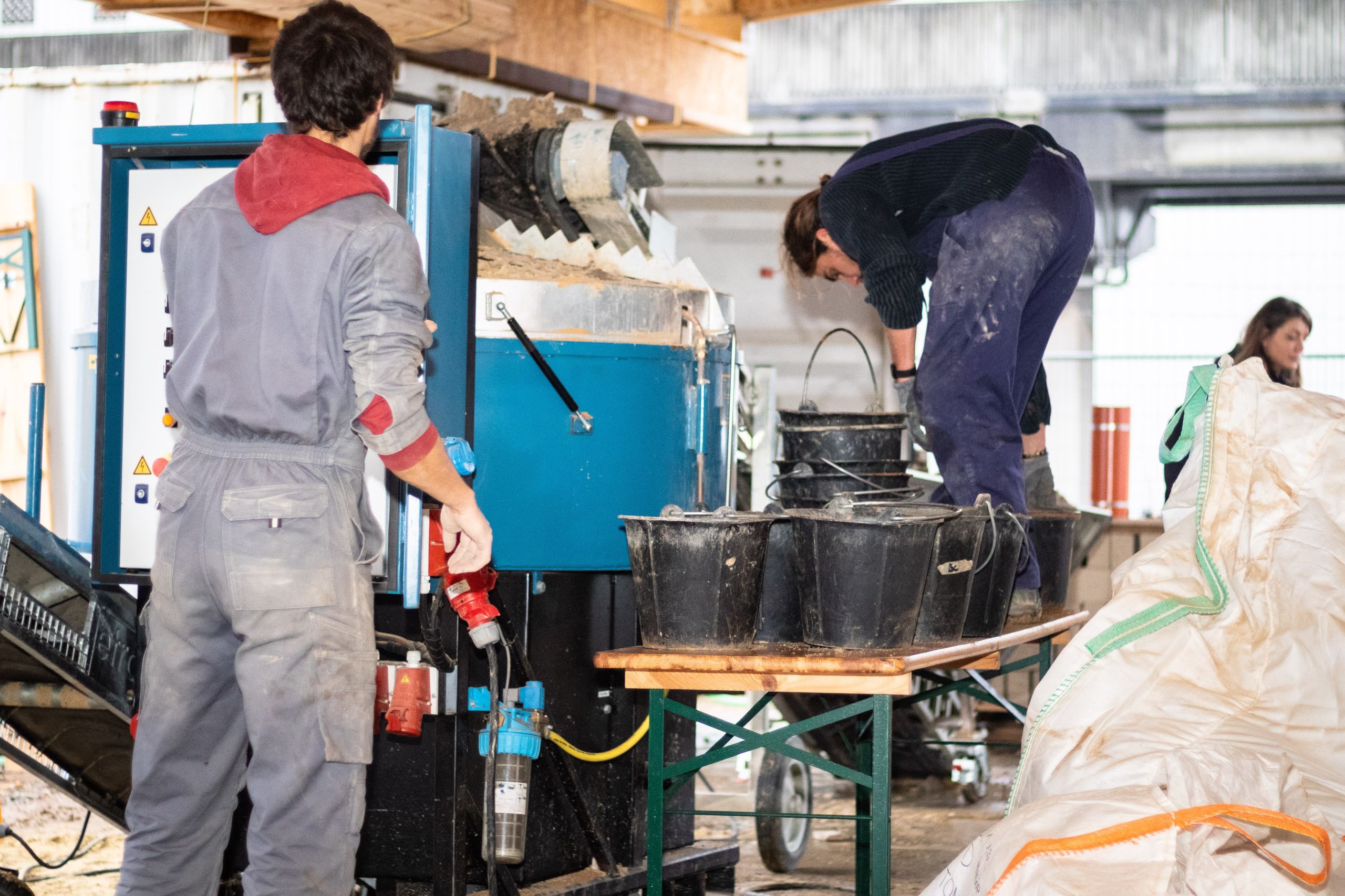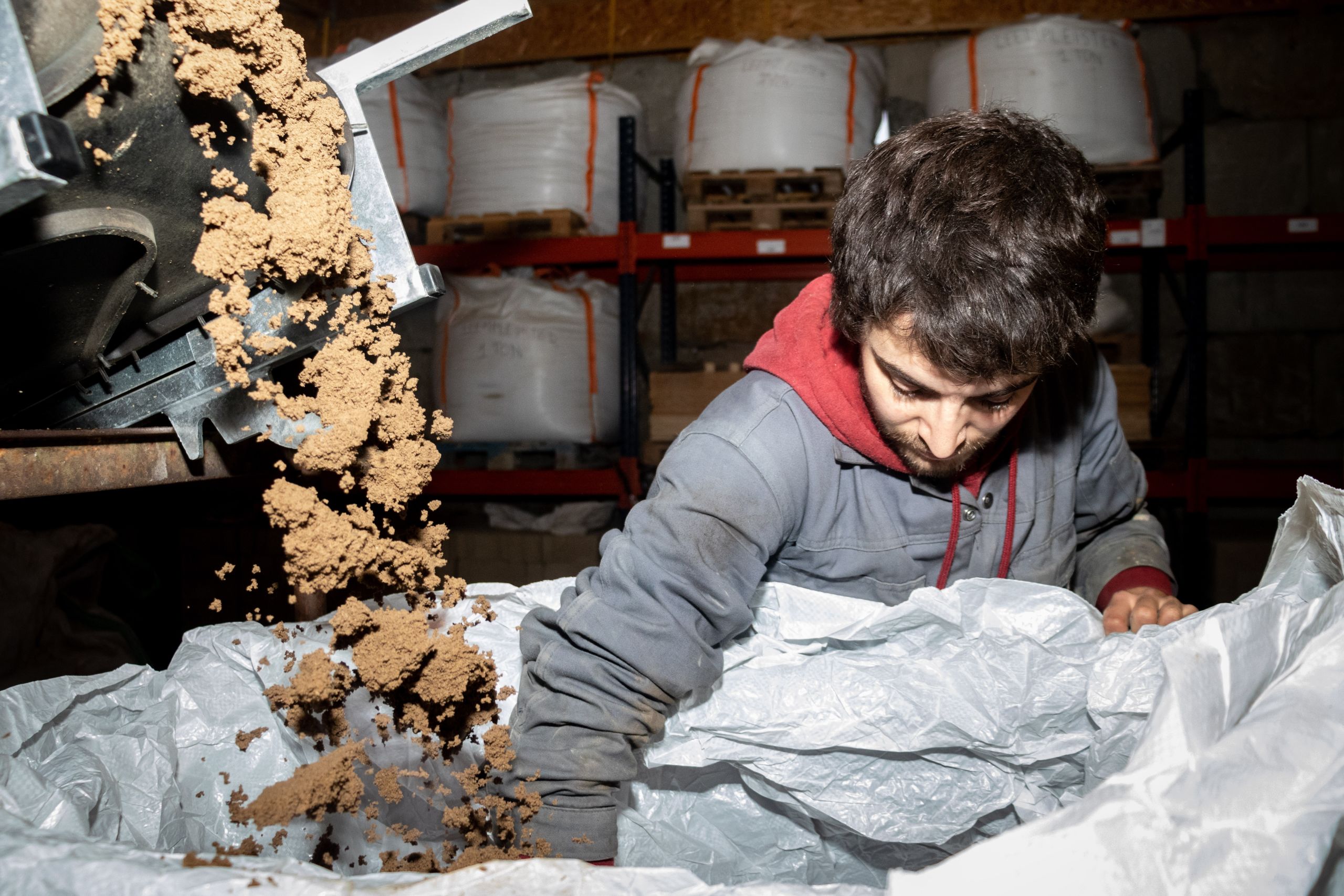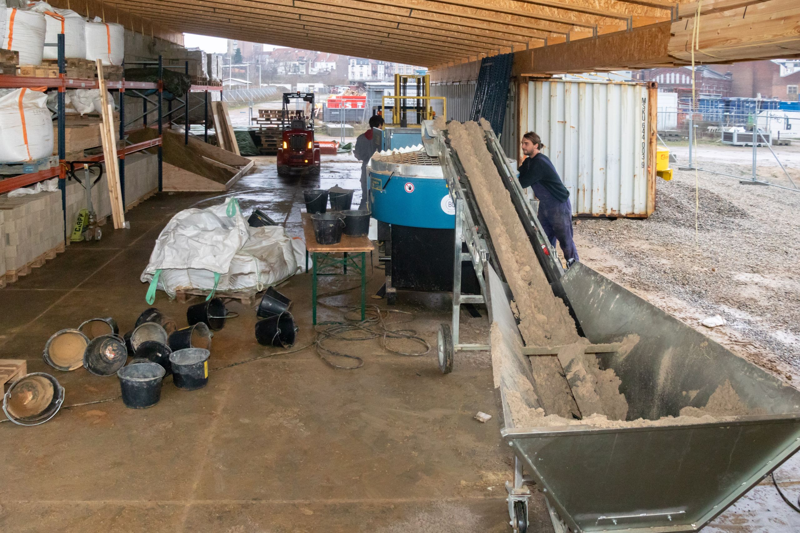 Les seaux de sable ont succédé aux seaux d’argile sur le tapis roulant. Celui-ci déverse son contenu dans une espèce de gros mixer où s’opère un mélange savamment dosé, qui est ensuite conditionné dans un big bag installé au bout d’un second tapis roulant. « Là, nous préparons un mortier qui est utilisé pour lier nos briques de terre crue », décrit Anton Maertens, advocacy manager de BC Materials.