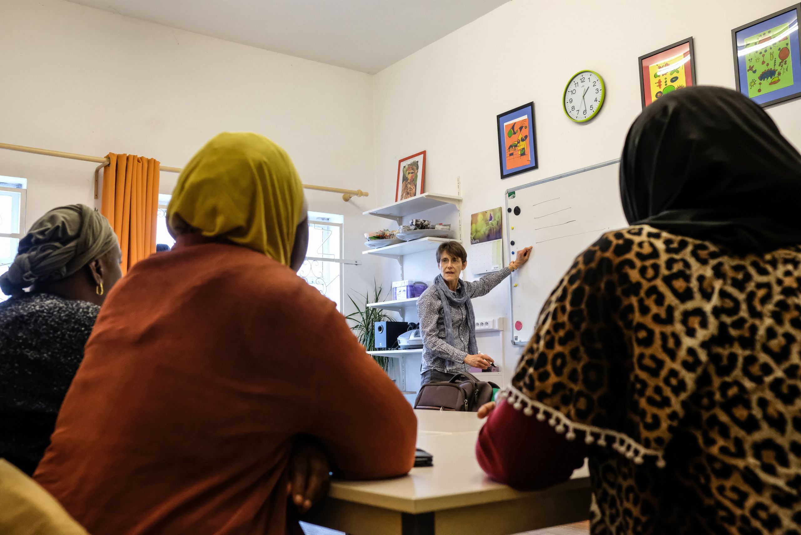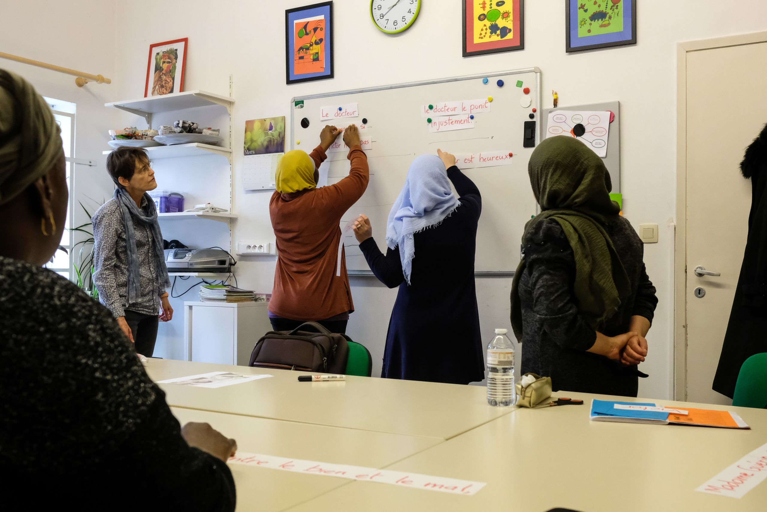 “Comme tous les enfants” , “se demande si”, “un animal dressé” : trois petits bouts de phrases qui nous paraissent si simples à lire. Mais qui sont loin de l’être pour cette classe d’une dizaine de femmes issues de l’immigration. Difficiles à lire mais également à prononcer. Le “tous” devient “tu” ; le ‘dressé”, “dressi” ; et le “si” un “sé”. “La plupart de ces femmes ne savaient ni lire ni écrire avant de venir chez nous. Elles ne parlaient pas non plus français. Certains sons n’existent pas dans leur langue maternelle”, explique Patricia, formatrice bénévole depuis huit ans auprès de l’association Formosa. “Prenons le mot ‘élève’. Si on ne fait pas la différence entre ‘é’ et ‘è’, on ne sait pas où placer l’accent.”